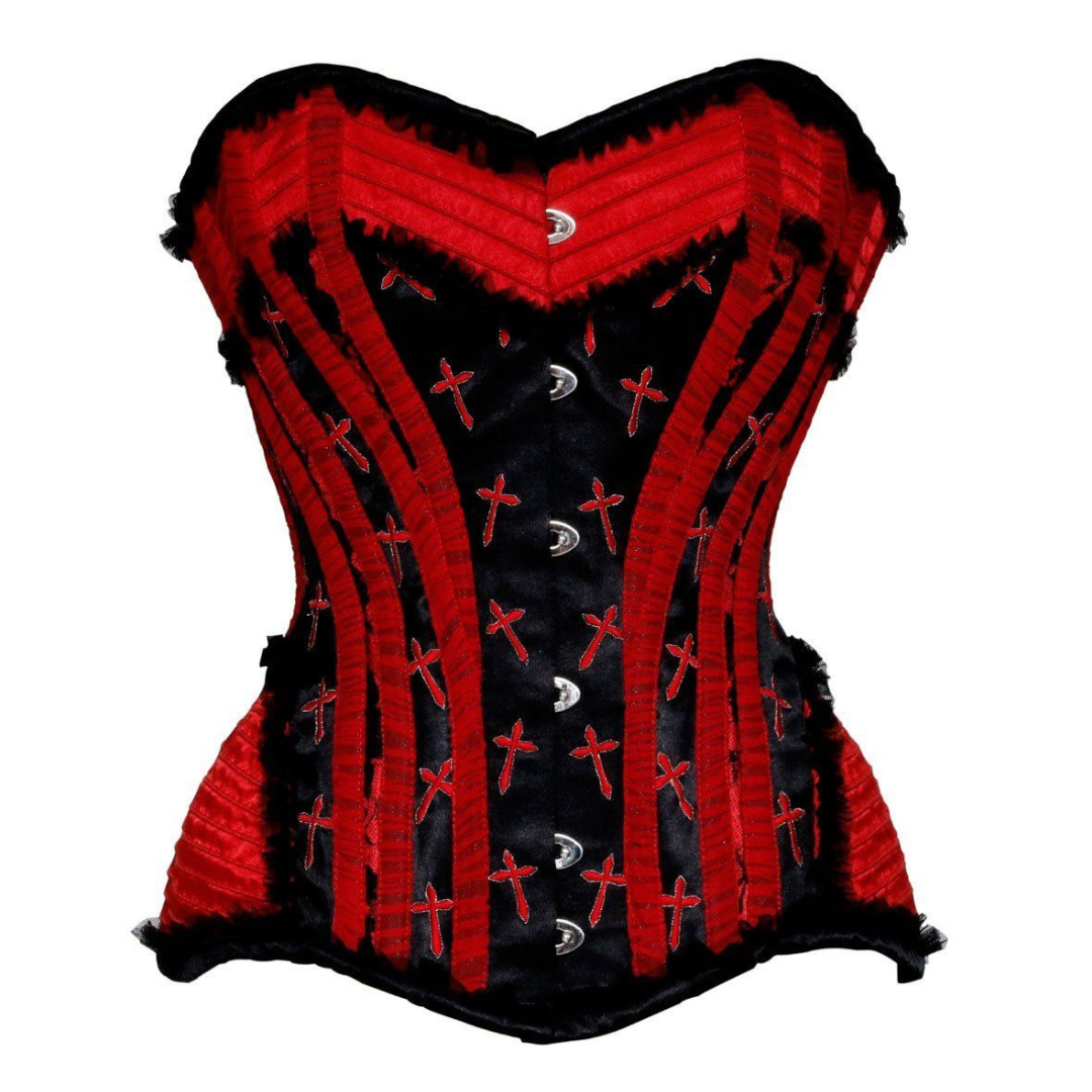 Introducing the Persephone Crucifix Corset, a stunning addition to our collection of premium corsets. This dramatic red and black corset is adorned with bold embroidered crucifix designs, perfect for those with a taste for gothic-inspired styling. The front of this design features a classic clasp closure, while the rear has a traditional lacing for the greatest range of adjustment and body shaping.