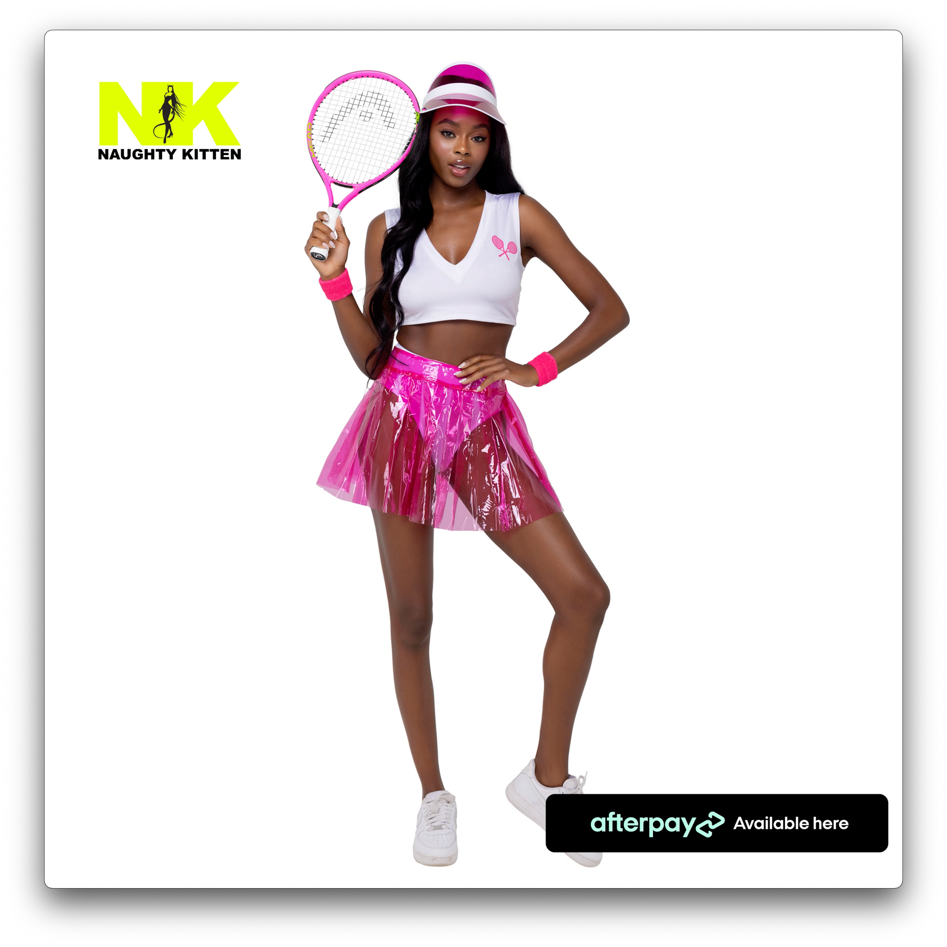 Introducing our Tennis Court Hottie Costume, the ultimate choice for those seeking a captivating and playful Halloween ensemble. This sexy women's costume from the genuine Roma Costume range, includes a variety of alluring elements, designed to make you the center of attention at any Halloween party or fancy dress event. Get ready to turn heads with this all-in-one ensemble, featuring a Crop Top, Visor, Pink Clear Vinyl Skirt, Shorts, and Sweatbands. (Please note that the racket is not included.)